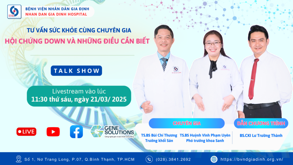 Ngày 21/03/2025, nhân Ngày Hội chứng Down Thế giới, Bệnh viện Nhân dân Gia Định phối hợp cùng Gene Solutions Việt Nam tổ chức livestream “Tư vấn sức khỏe cùng chuyên gia” trên YouTube và Fanpage. Chương trình có sự tham gia của TS.BS. Bùi Chí Thương, TS.BS. Huỳnh Vĩnh Phạm Uyên và được dẫn dắt bởi ThS.BS. Lư Trường Thành, cung cấp kiến thức chuyên sâu về nguyên nhân, biểu hiện và phương pháp tầm soát hội chứng Down.