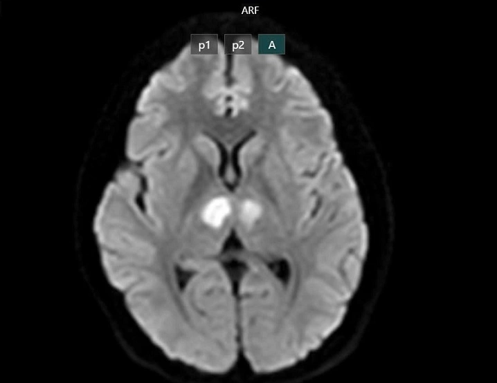 Phim chụp cho thấy não bệnh nhân bị tổn thương vùng đồi thị hai bên. Ảnh: Bác sĩ cung cấp